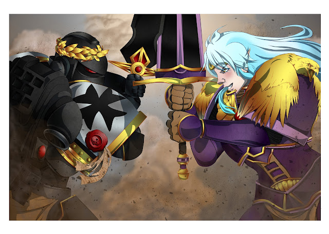 On the 12th day of warhammer month.... you get Caminus playing around against and Emperor's Champion. So self proclaimed second coming of Fulgrim, a Chaos Lord of an atypical and eclectic group of the Emperor's Children, and commander of the battleship Pride of the Emperor, versus an unnamed space marine, an Adeptus Astartes, a Black Templar, wearing the holy raiment and wielding a Black Sword. This was one of the 2018 posters for Battle Zone Ursa